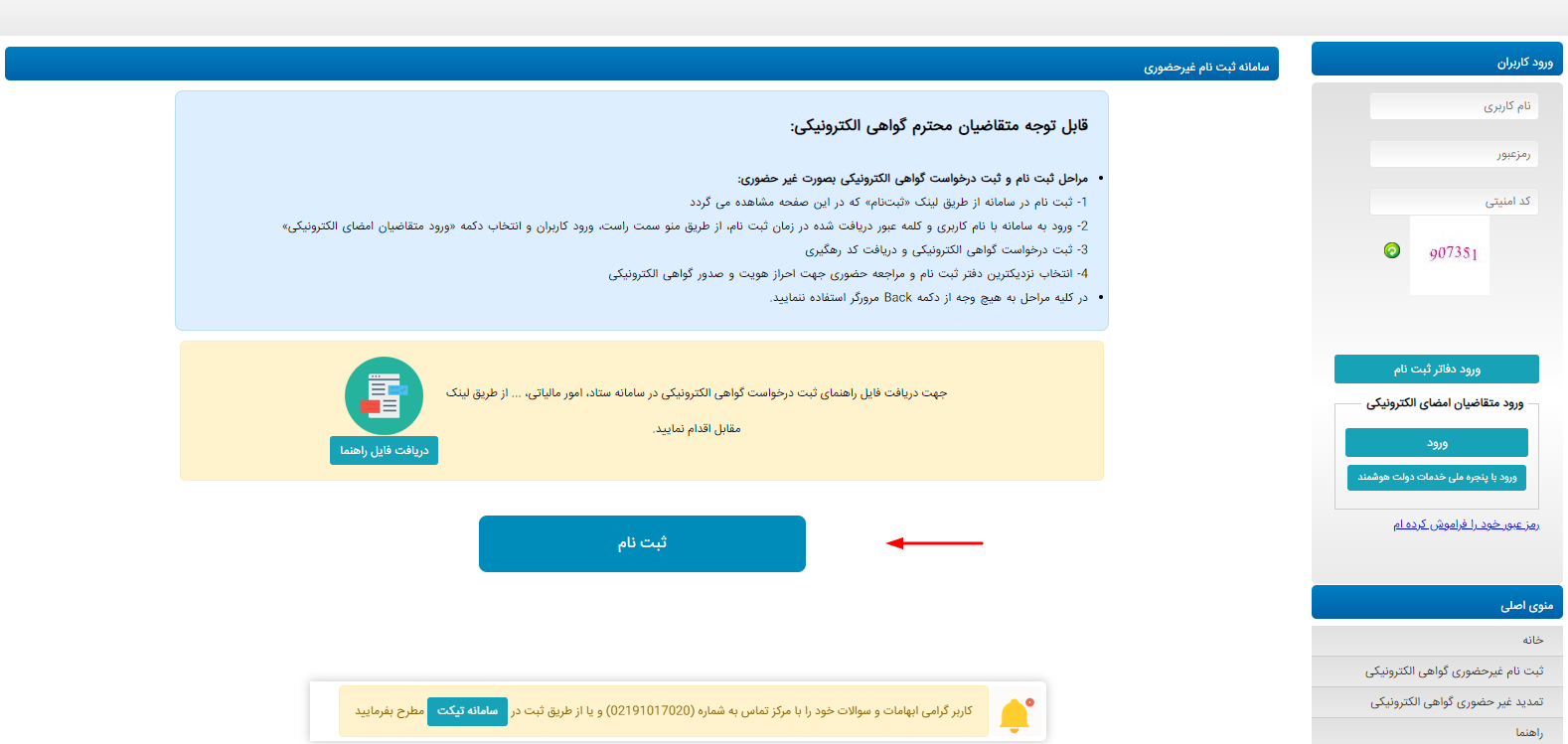 در مرحله بعد و در صفحه جدیدی که باز می‌شود، نکات مهم جهت ثبت نام و همچنین فایل راهنمای ثبت درخواست گواهی الکترونیکی جهت بررسی و دانلود در دسترس شما قرار دارد. بعد از بررسی و مطالعه فایل بر روی دکمه “ثبت نام” که با رنگ آبی در پایین صفحه نمایش داده شده است کلیک کنید: