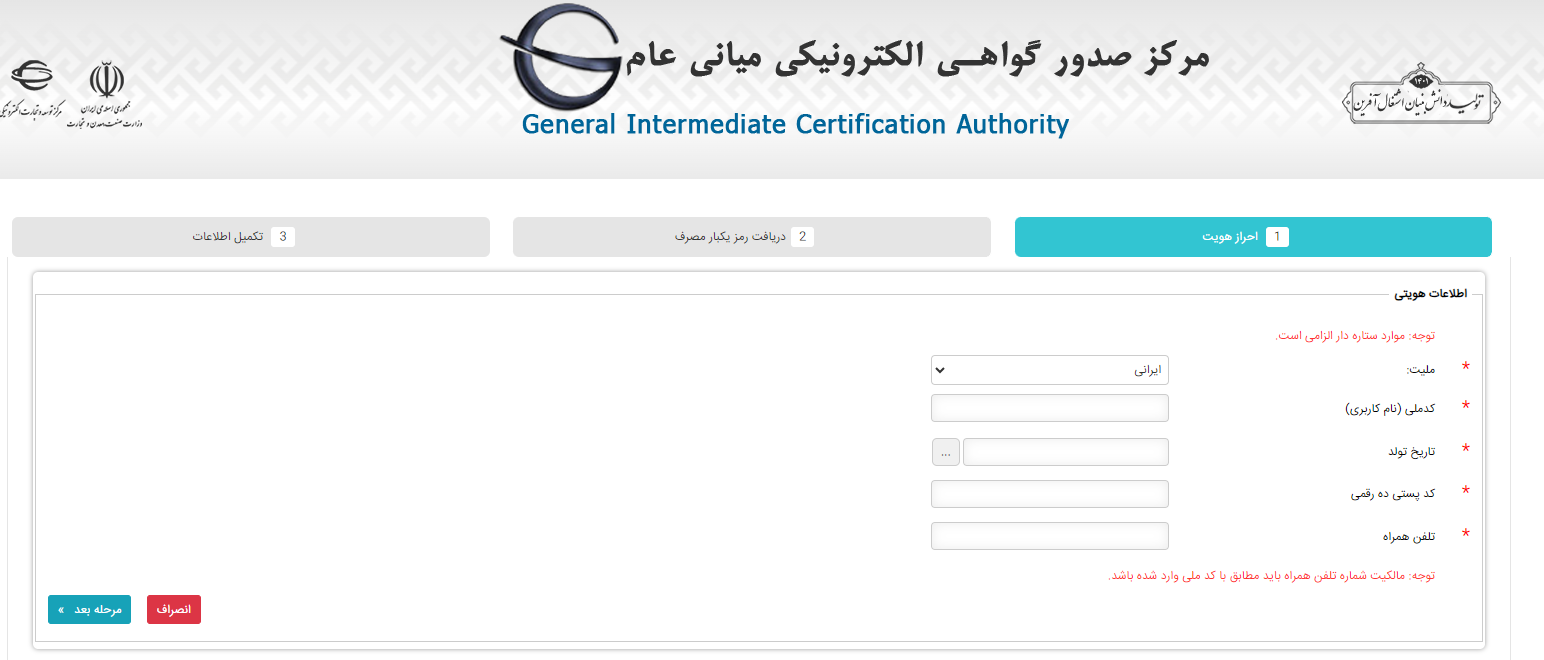 در صفحه جدیدی که برای شما باز می‌شود سه تب احراز هویت، دریافت رمز یکبار مصرف و تکمیل اطلاعات وجود دارد که می‌بایست به ترتیب هر مرحله را انجام دهید و سپس بر روی دکمه مرحله بعد کلیک کنید.