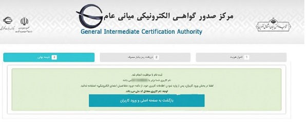 در این صفحه می‌توانید با کلیک بر روی دکمه “بازگشت به صفحه اصلی و ورود کاربران” با استفاده از نام کاربری و کلمه عبوری که در مرحله قبل تعیین کردید وارد حساب کاربری خود در سایت شوید و درخواست صدور گواهی امضای الکترونیک یا CSR را ثبت کنید.