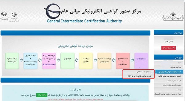 در صفحه حساب کاربری در منو اصلی گزینه ثبت درخواست گواهی الکترونیکی را انتخاب کنید؛ در تب باز شده دو گزینه “ثبت درخواست گواهی” و ” ثبت درخواست گواهی از طریق CSR” وجود دارد. اگر بر روی گزینه اول یعنی ثبت درخواست گواهی کلیک کنید می‌بایست پس از دریافت گواهی امضا به دفاتر پیشخوان دولت مراجعه کنید و کد یا توکن گواهی امضای الکترونیک را به صورت حضوری دریافت کنید.