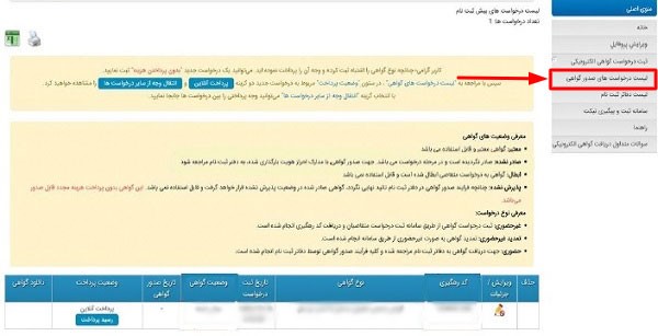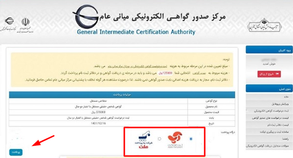 در صفحه جدید جزئیات درخواست و هزینه پرداختی مشخص شده است. با انتخاب درگاه پرداخت بانکی می‌توانید هزینه درخواست گواهی الکترونیکی را پرداخت کنید.